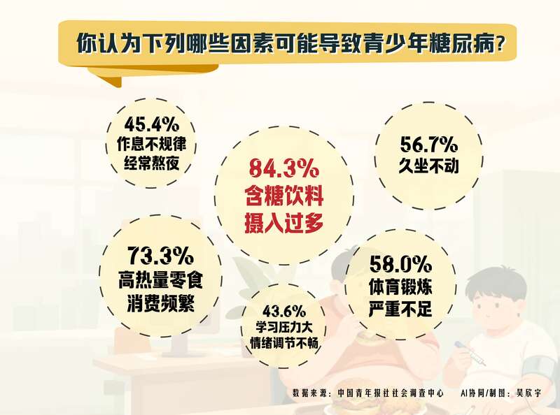 11月14日是世界糖尿病日。近年来,糖尿病发病呈现年轻化趋势。面对这一严峻的公共卫生挑战,国家发布了《健康中国行动——糖尿病防治行动实施方案(2024—2030年)》,将青少年列为重点防控人群。本周,中国青年报社社会调查中心联合问卷网(wenjuan.com),对1334名受访者进行的一项调查显示,78.9%的受访者认为自己了解糖尿病(如成因、类型或症状),77.4%的受访者感觉近年来身边青少年糖的摄入量更大了,84.3%的受访者认为含糖饮料摄入过多(如奶茶、碳酸饮料)是导致青少年糖尿病的主要原因。