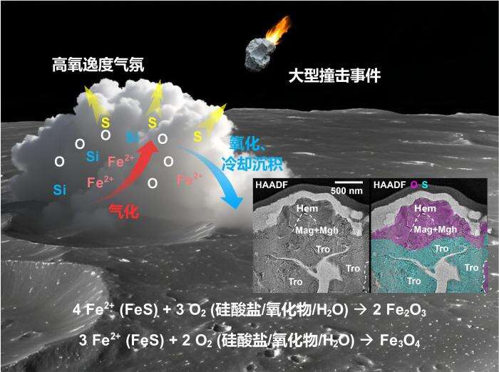 嫦娥六号样品中发现的铁氧化物成因示意图。图中表示了月球表面物质在大尺度撞击下气化,产生局部的高氧逸度气氛。高温环境使得陨硫铁矿物脱硫,并在适当的温度条件下被高氧逸度的气氛氧化,形成了赤铁矿、磁赤铁矿和磁铁矿。山东大学供图