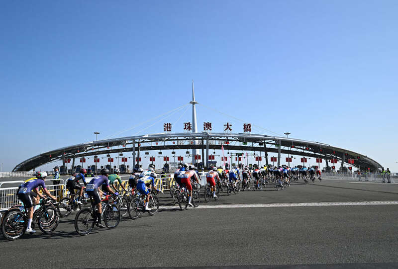 11月8日,在第十五届全国运动会公路自行车男子个人赛决赛中,参赛选手在港珠澳大桥骑行。新华社记者 梁旭 摄