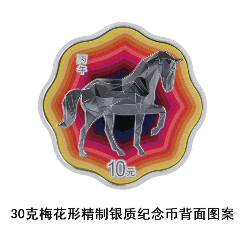 30克梅花形银质纪念币背面图案为装饰马造型,并刊“丙午”字样及面额。