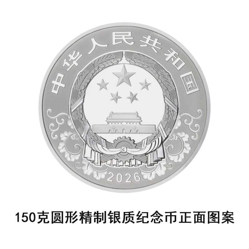 150克圆形银质纪念币为精制币,含纯银150克,直径70毫米,面额50元,成色99.9%,最大发行量8000枚。