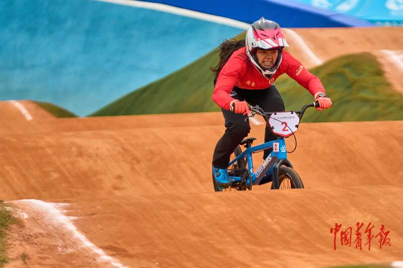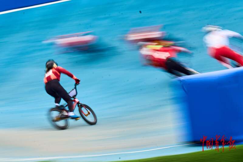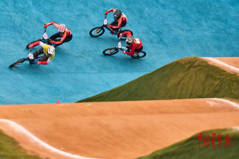 11月19日,广东深圳光明区竞速小轮车场,全运会竞速小轮车女子竞速赛决赛,选手们在比赛中。中青报·中青网记者 田嘉硕/摄