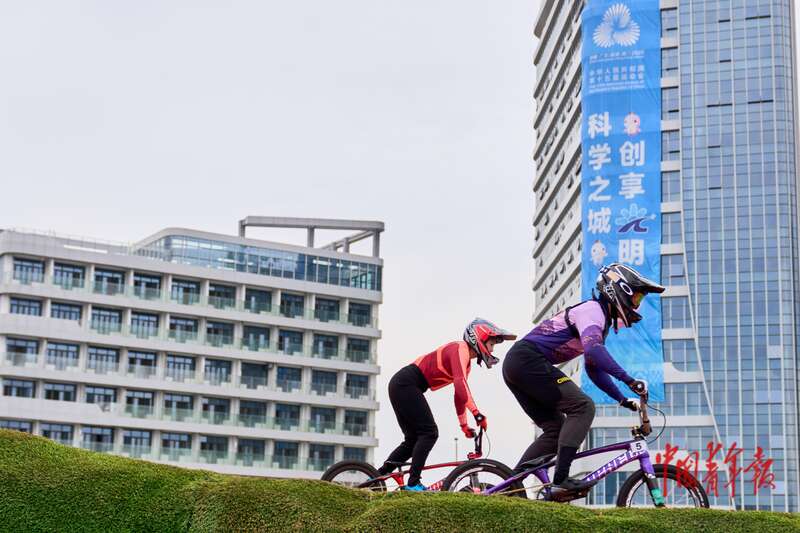 11月19日,广东深圳光明区竞速小轮车场,全运会竞速小轮车女子竞速赛半决赛,选手们在空中腾跃。在当日举行的竞速小轮车决赛中,山东队选手林浩超、广东队选手廖婉仪分别夺得男子、女子冠军。中青报·中青网记者 田嘉硕/摄