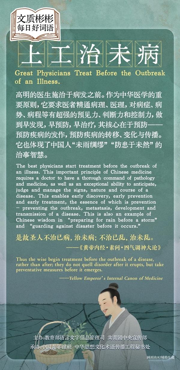 高明的医生施治于病发之前。作为中华医学的重要原则,它要求医者精通病理、医理,对病症、病势、病程等有超强的预见力、判断力和控制力,做到早发现,早预防,早治疗,其核心在于预防——预防疾病的发作,预防疾病的转移、变化与传播。它也体现了中国人“未雨绸缪”“防患于未然”的治事智慧。