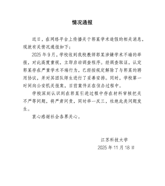 11月18日,江苏科技大学通报郭某学术造假事件:已解聘,案件正在侦办。