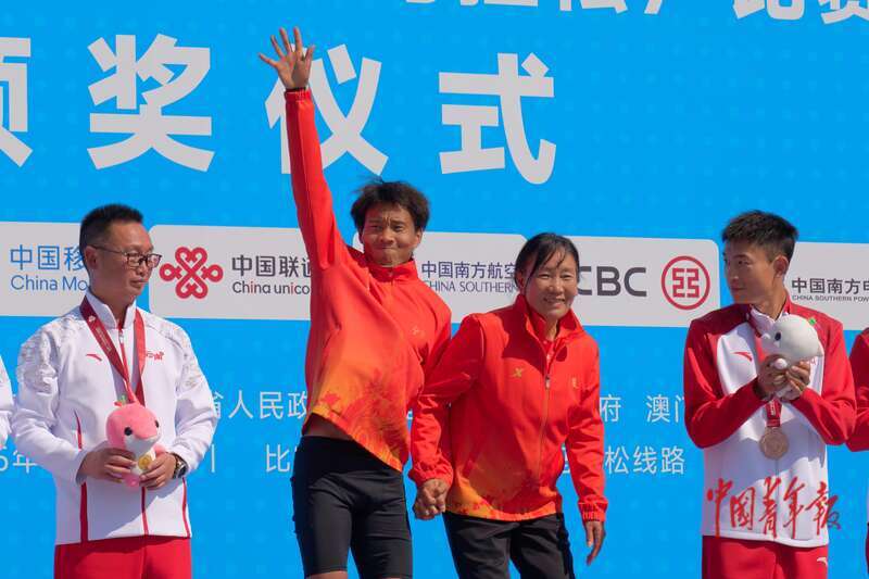 On November 15th, the Athletics (Marathon) awards ceremony for the 15th National Games was held in Shenzhen, Guangdong. Ningxia athlete He Jie claimed the men's marathon championship with a time of 2:12:07, sharing the podium with his coach.