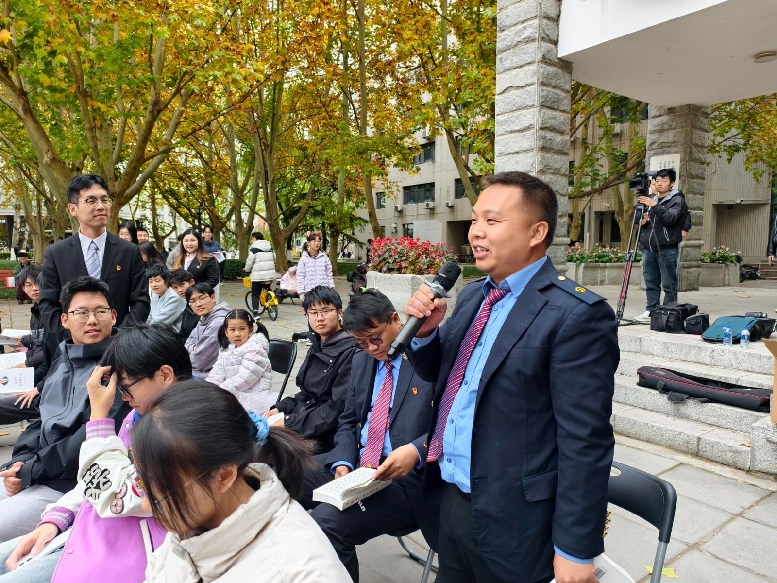 距离运输设备馆步行约5分钟,校园世纪钟前的空地上也开讲了。记者发现,驻足听讲的不仅有大学师生,还有身着制服的铁路职工,甚至是和父母进校参观的小学生。