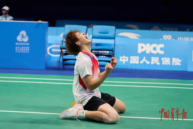 11月20日,广东深圳,深圳市体育中心体育馆,全运会羽毛球项目成年组男子双打决赛,安徽队选手刘阳在胜利后跪地呐喊。这场比赛,安徽队刘阳、刘毅以总比分2:1战胜浙江队谢浩南、王昶夺金。中青报·中青网记者 田嘉硕/摄