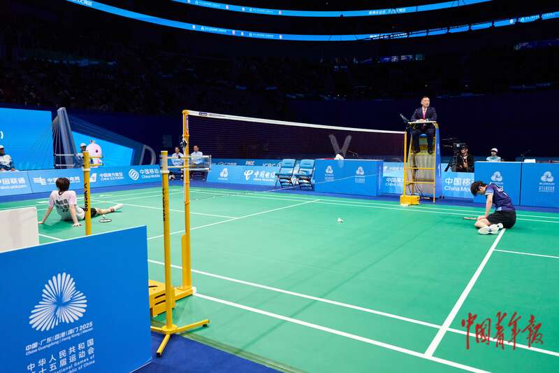 11月20日,广东深圳,深圳市体育中心体育馆,全运会羽毛球项目成年组女子单打决赛,长时间对攻后,王祉怡(右)与陈雨菲均瘫坐在赛场上。经过近100分钟鏖战,湖北队选手王祉怡以总比分1:2逆转奥运冠军、浙江名将陈雨菲,夺得金牌。整场比赛对抗激烈,赛后,两人均由工作人员搀扶进入新闻发布厅。中青报·中青网记者 田嘉硕/摄