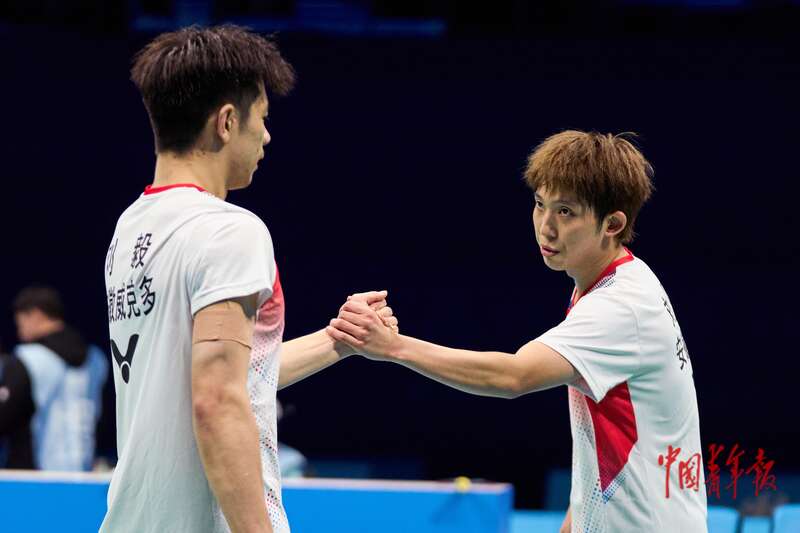 11月20日,广东深圳,深圳市体育中心体育馆,全运会羽毛球项目成年组男子双打决赛,安徽队选手刘阳(右)、刘毅在比赛中。中青报·中青网记者 田嘉硕/摄