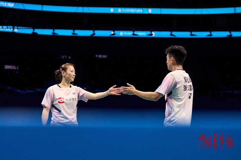 11月20日,广东深圳,深圳市体育中心体育馆,全运会羽毛球项目成年组混合双打决赛,混双名将“雅思”组合郑思维(左)、黄雅琼在比赛中。他们最终以总比分2:0战胜湖南队周志宏、魏雅欣夺金。中青报·中青网记者 田嘉硕/摄