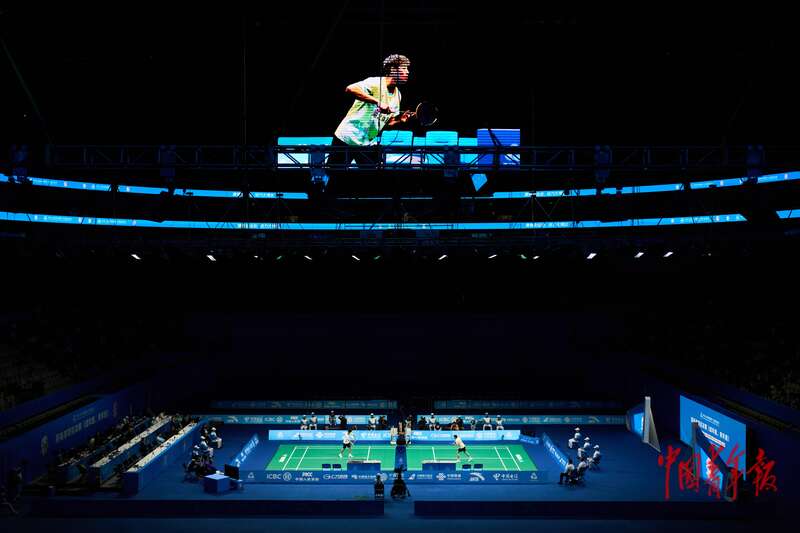 11月20日,广东深圳,深圳市体育中心体育馆,全运会羽毛球项目成年组男子单打决赛正在进行中,福建队选手翁泓阳对阵湖北队选手朱轩辰。中青报·中青网记者 田嘉硕/摄