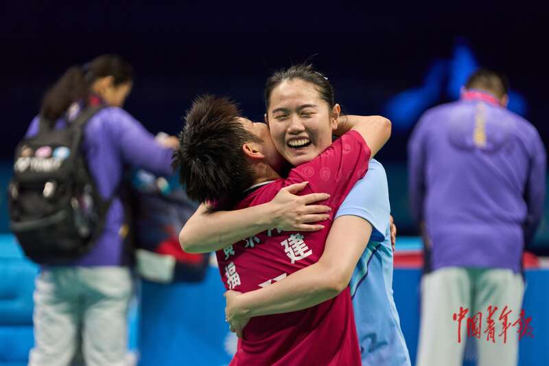 11月20日,广东深圳,深圳市体育中心体育馆,全运会羽毛球项目成年组女子双打决赛后,福建队选手黄东萍(左)与四川队选手郑雨相互拥抱。中青报·中青网记者 田嘉硕/摄