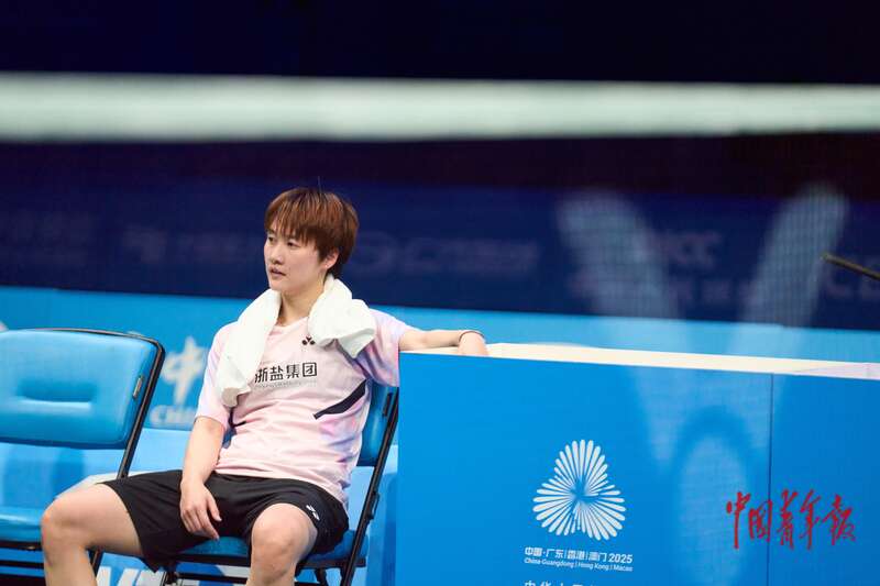 11月20日,广东深圳,深圳市体育中心体育馆,全运会羽毛球项目成年组女子单打决赛后,浙江队选手陈雨菲瘫坐在场边座椅上。中青报·中青网记者 田嘉硕/摄