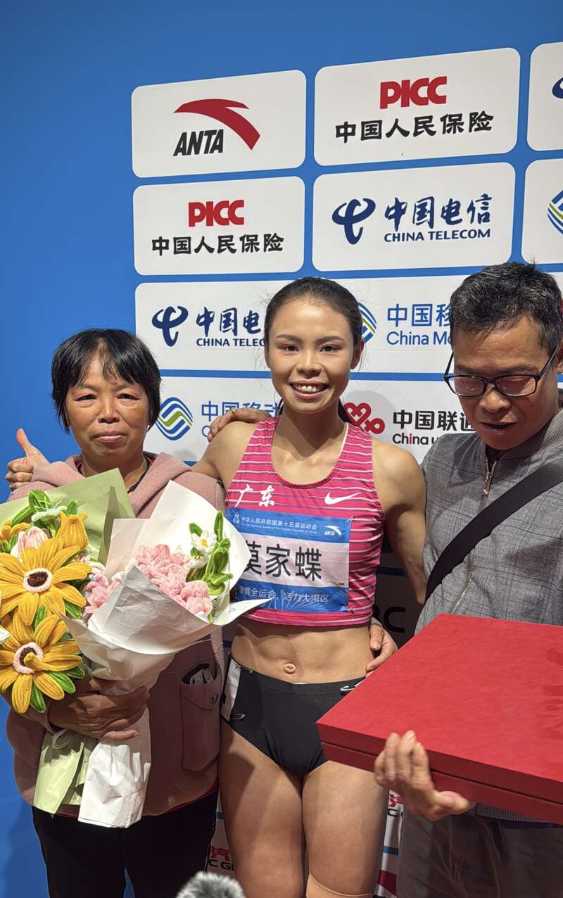 11月20日,十五运会女子4x400米决赛过后,莫家蝶与“惊喜现身”的父母合影。中青报·中青网记者 李梓昂/摄