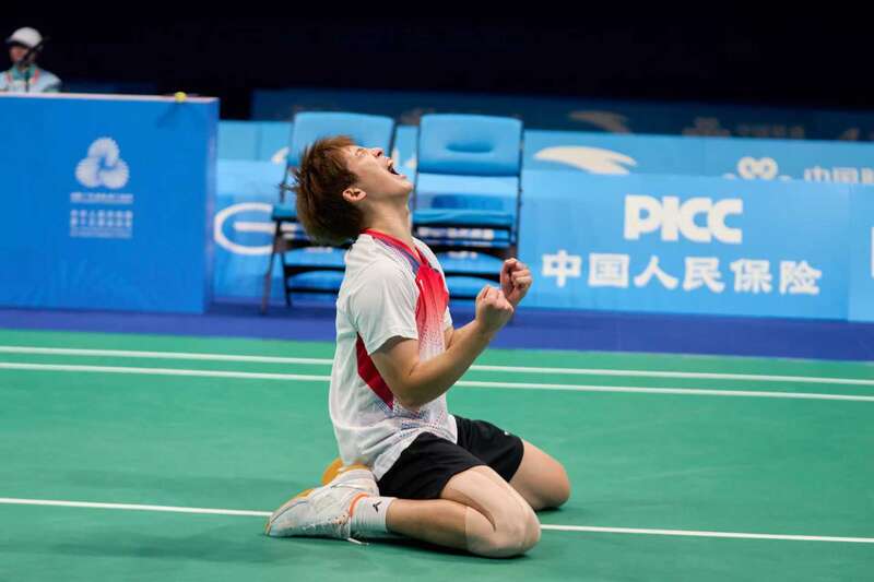 11月20日,十五运会羽毛球男双决赛中,刘阳在赛后跪地庆祝胜利。中青报·中青网记者田嘉硕/摄
