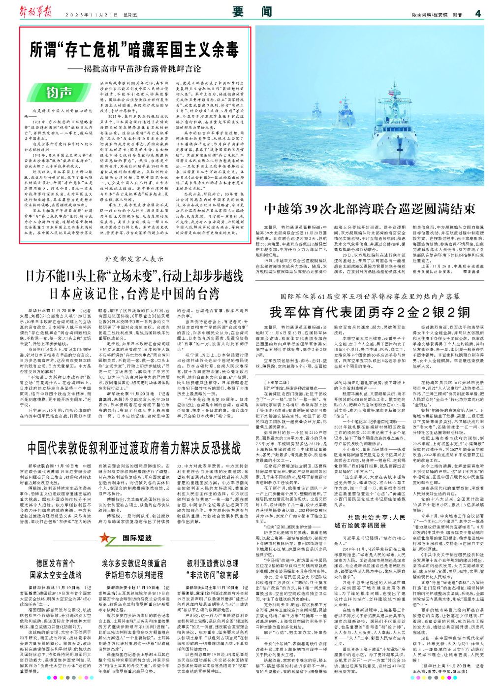 高市的狂言和军事扩张设想,罔顾法理和历史事实,从根本上否定了日本遵循和平宪法、作为和平国家的发展道路,暴露了“战争国家的丑恶嘴脸”。其刻意渲染所谓“存亡危机”,不惜将日本民众绑上以邻为壑战车的做法,一旦把军国主义战争怪兽释放出来,必将置日本于万劫不复之地。正如日本《社会新报》一篇社论指出的那样:“高市作为首相的存在本身才是日本的存亡危机。”