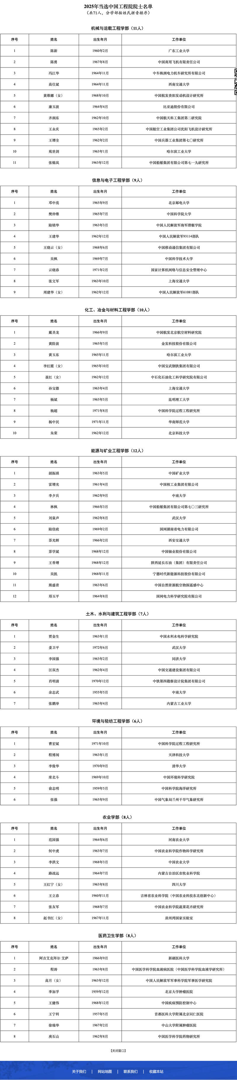 中国青年报客户端北京11月21日电(中青报·中青网记者 张茜)今天,中国工程院公布了2025年院士增选当选院士名单、当选外籍院士名单。共有71位来自工程科技各领域的专家当选中国工程院院士,其中机械与运载工程学部11位,信息与电子工程学部9位,化工、冶金与材料工程学部10位,能源与矿业工程学部12位,土木、水利与建筑工程学部7位,环境与轻纺工程学部6位,农业学部8位,医药卫生学部8位。此外,24位外籍专家当选中国工程院外籍院士。