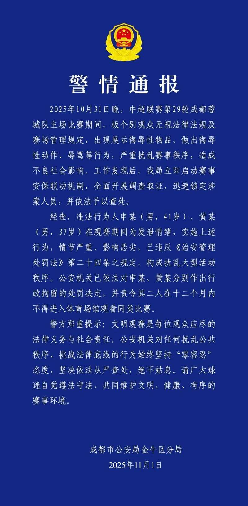 球迷做出歧视性、侮辱性言行!中足联:成都蓉城罚款50万元