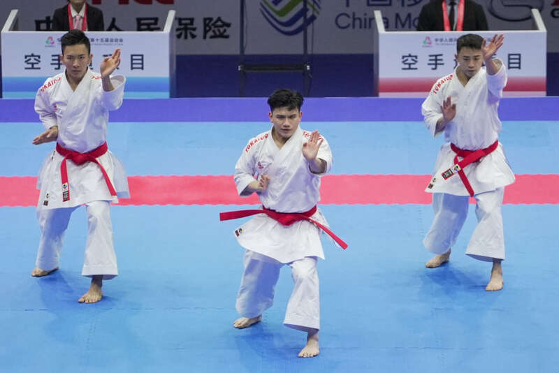 2025年11月6日,澳门代表队在澳门举行的第十五届全国运动会群众比赛项目空手道男子业余组团体型半决赛中。新华社发