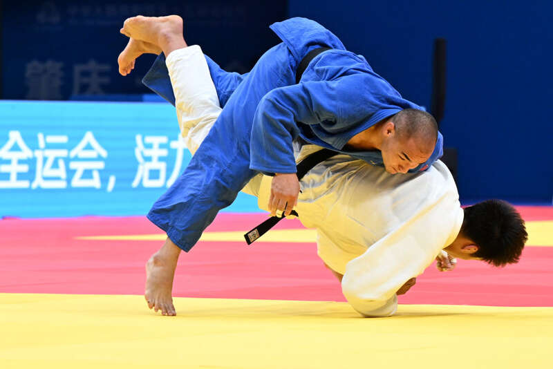 2025年11月12日,新疆队选手阿卜杜热西提·杰力力(上)和山东队选手汪洋在广东肇庆举行的男子90公斤级铜牌赛中。新华社记者 朱祥 摄