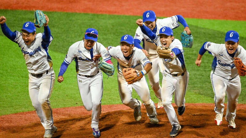 2025年11月19日,广东队球员在广东中山举行的第十五届全国运动会棒球1-4名交叉赛后庆祝胜利。新华社记者 丁磊 摄