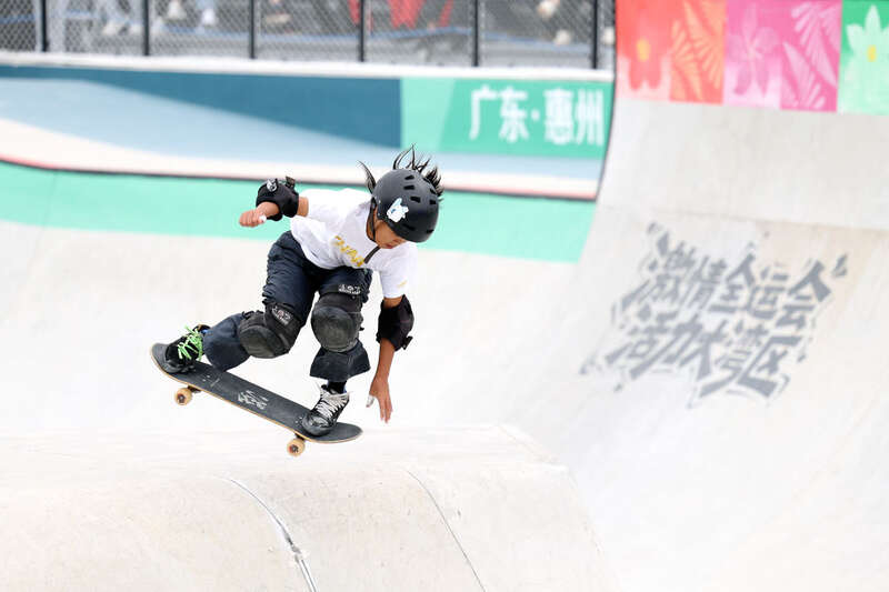 2025年11月11日,广东队选手邹明珂在广东惠州举行的第十五届全国运动会滑板项目女子碗池赛决赛中。新华社记者 卢汉欣 摄