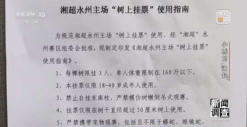 以永州市足协的名义贴出了一份《湘超永州主场“树上挂票”使用指南》,幽默地配合网友们的调侃,例如:每棵树限挂3人,单人体重限制在160斤以下;禁止自挂东南枝,严禁模仿树懒倒吊式观赛等等。在网上,永州“挂票”成为热词。