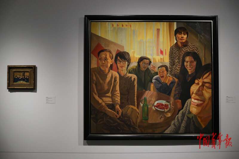 11月23日,北京泰康美术馆,刘小东大型个展“河东,河西”现场,刘小东作于1990年的作品《笑话》(右)。该作品取材于朋友聚会的场景,艺术家以分头写生和拼接构图呈现出一种摄影般的真实与即时性。中青报·中青网记者 孔斯琪/摄