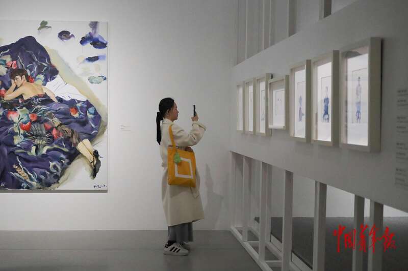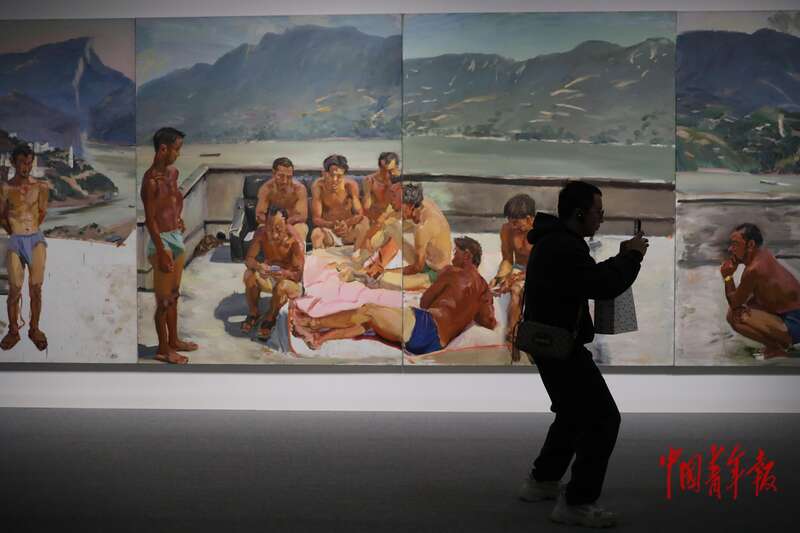 11月23日,北京泰康美术馆,刘小东大型个展“河东,河西”现场,一名参观者在拍摄刘小东2025年的新作《少年通天》和《天门关》。这两件新作描绘了革命老区太行山的“Z世代”少年,他们的姿态、目光和精神气质,与往昔的记忆之间形成了隐秘的回响。2025年11月25日至2026年3月31日,中国当代知名艺术家、中央美术学院油画系教授刘小东的大型回顾展“河东,河西”将于泰康美术馆展出。展览展出了刘小东自20世纪70年代末至2025年的70余件原作,呈现了画家对时代气息的捕捉和描绘,以及用绘画对现实的回应。中青报·中青网记者 孔斯琪/摄