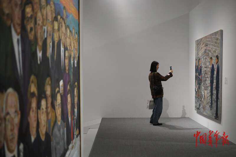 11月23日,北京泰康美术馆,刘小东大型个展“河东,河西”现场,一名参观者在拍摄刘小东《我这一家子》系列。中青报·中青网记者 孔斯琪/摄