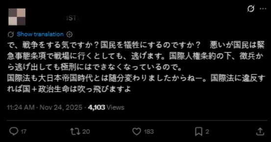 一些日本网友愤慨地留言道:“(高市政权)是执意要发动战争吗?是准备让民众去当‘炮灰’吗?任何违反国际法的行为,都将导致该国及其决策者的政治生命彻底终结。”