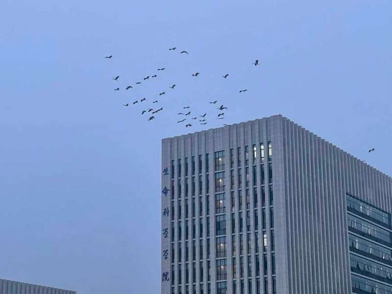 中国青年报客户端讯(茅文颖 中青报·中青网记者 王海涵 王磊)“孔雀东南飞,五里一徘徊”,千年古诗勾勒的迁徙图景,近日在安徽师范大学有了现实续篇——47只国家一级保护动物、有着“鸟中大熊猫”之称的东方白鹳,编队掠过该校生命科学学院清源楼上空,低空盘旋身影恰似一场“校园巡礼”,被路过的学院副教授陈潘用相机永久定格。