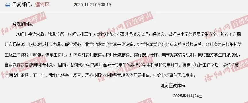 报道显示,11月初,当地教体局曾回复,午休椅由第三方单位免费提供,每天需缴纳0.9元使用费。近日的新回复则称,校方联合爱心企业推出成本价午休设施,经家委会商议达成共识后,为午托学生配置午休椅,收费按天核算,期末结算。同时坚持学生自愿原则,自主选择是否使用躺椅休息。