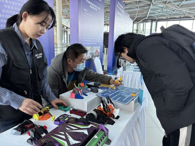 11月27日,第九届“创青春”黑龙江省青年创新创业大赛成果交流会现场,一个展示格斗机器人的摊位引起青年关注。中青报·中青网记者 杨雷/摄