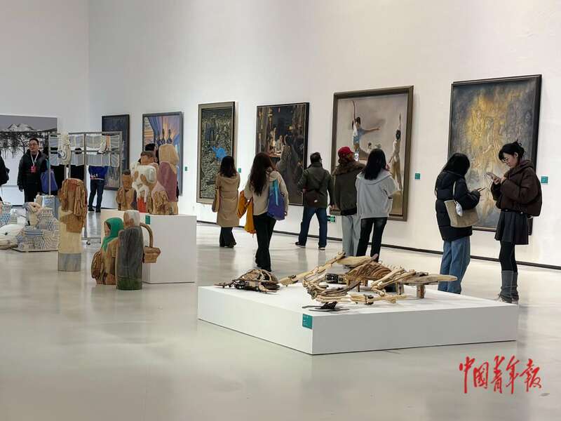 展厅中,青年艺术家在大国重器、科技创新、乡村振兴、城市蝶变、文化传承等时代主题和广袤的社会现场中寻找创作思路,探寻青年艺术表达。