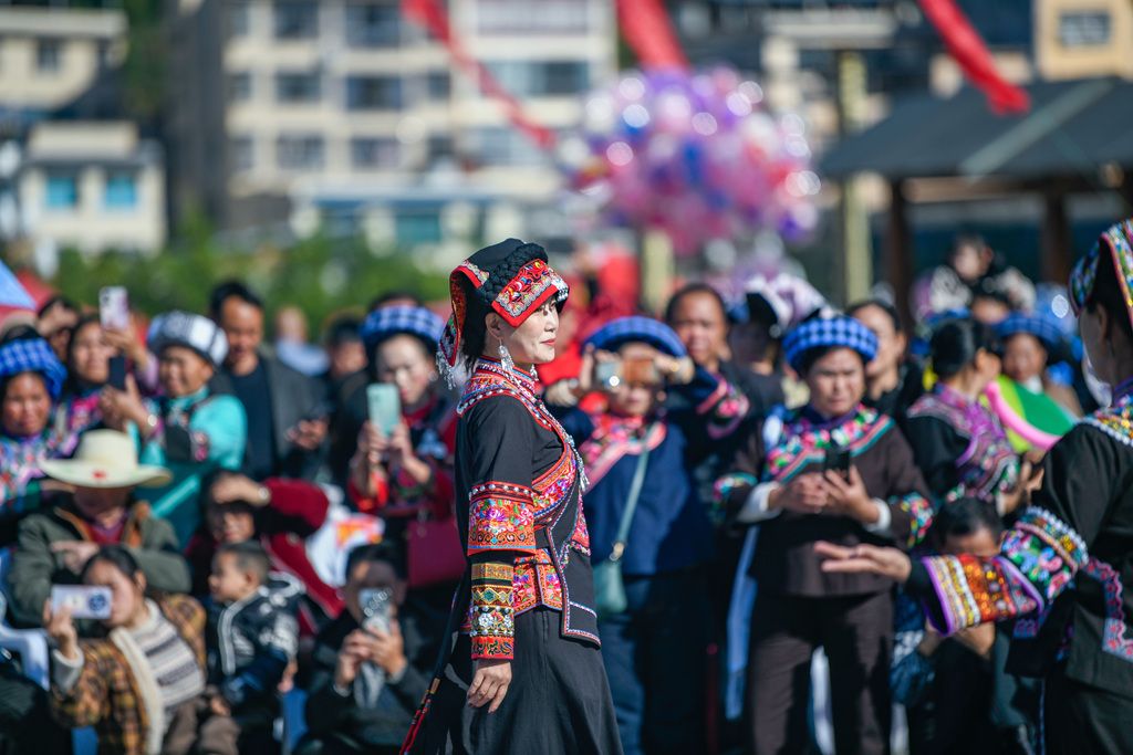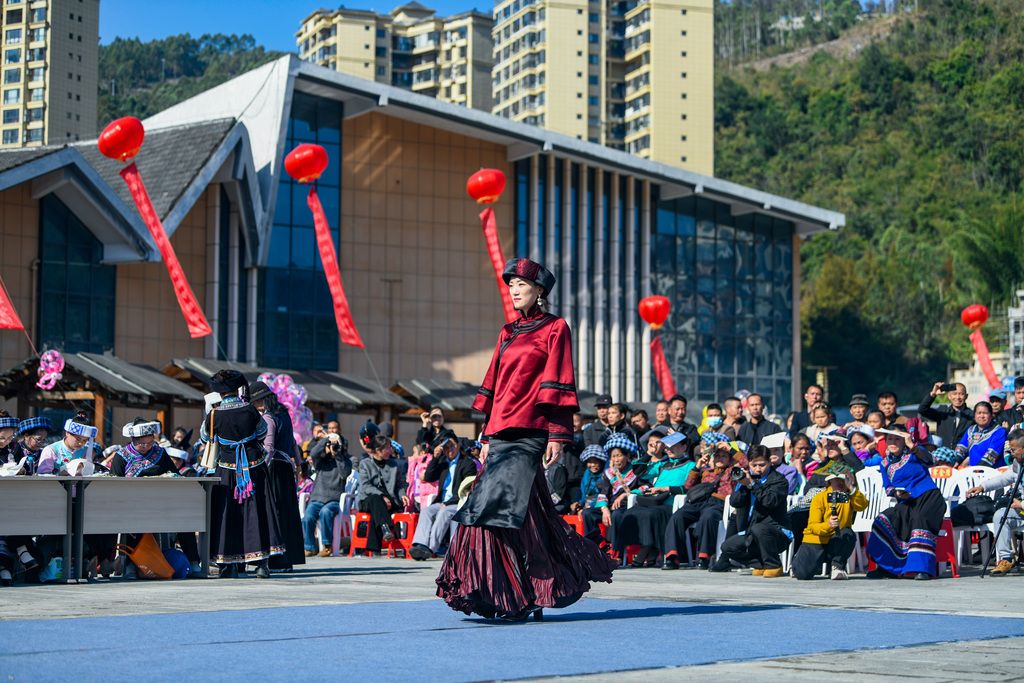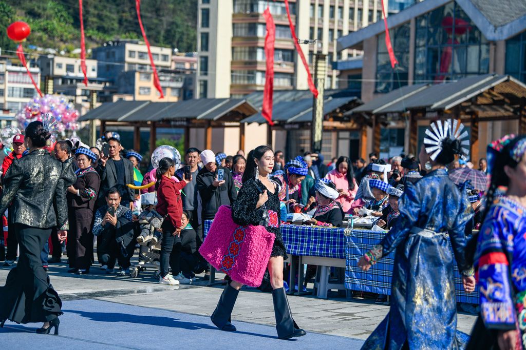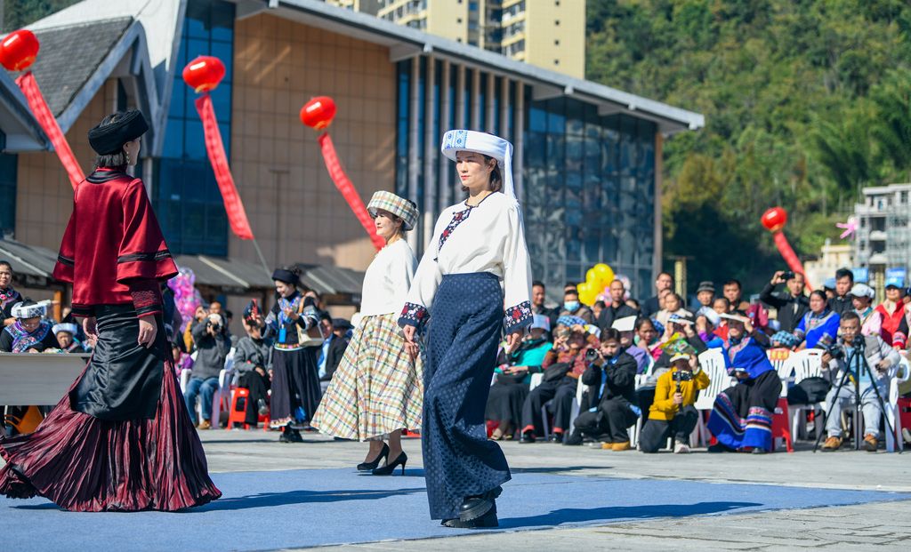 2025年11月30日,贵州省黔西南州,模特在册亨县纳福广场展示带有布依族元素的服饰。