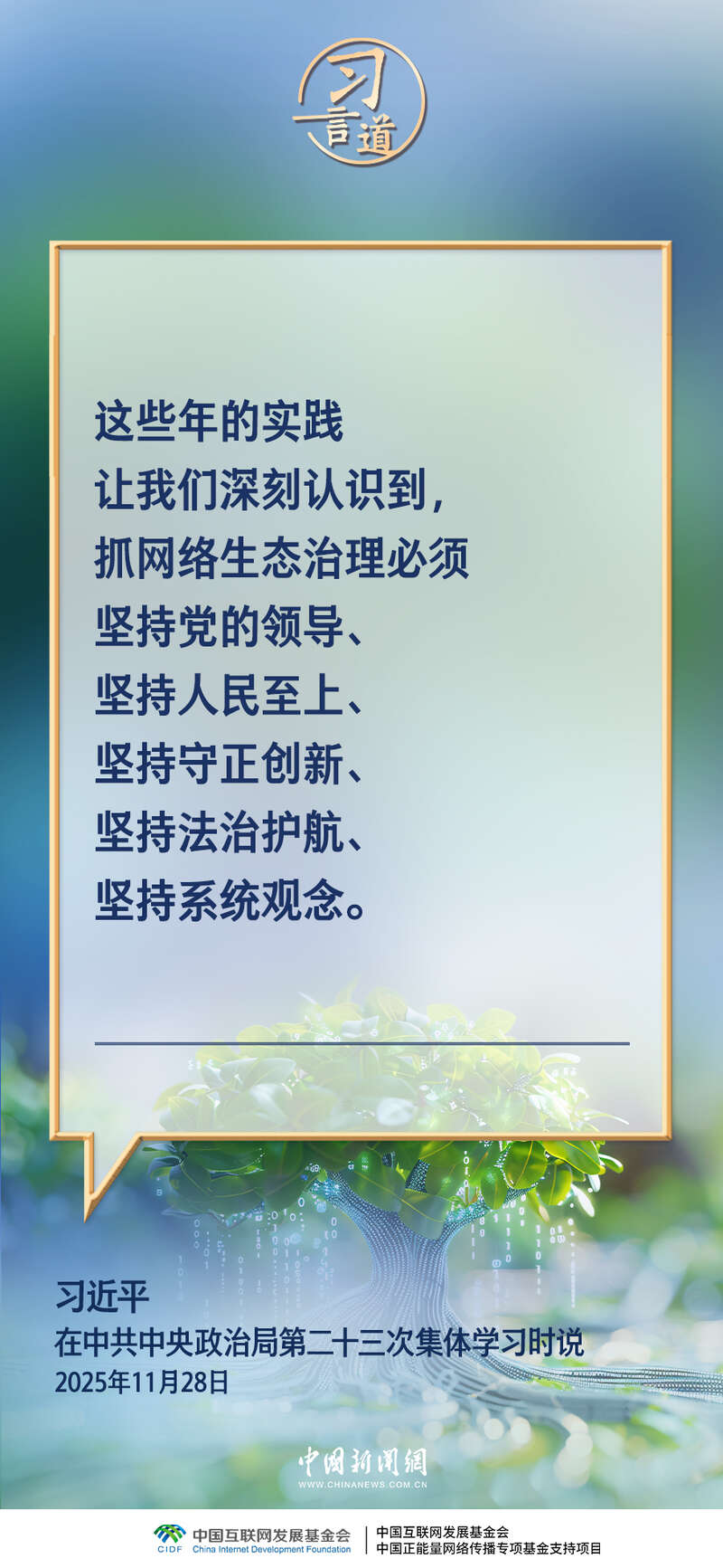 中共中央政治局11月28日就加强网络生态治理进行第二十三次集体学习。中共中央总书记习近平在主持学习时强调——