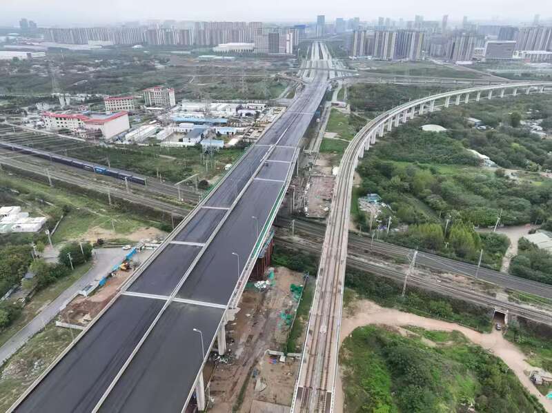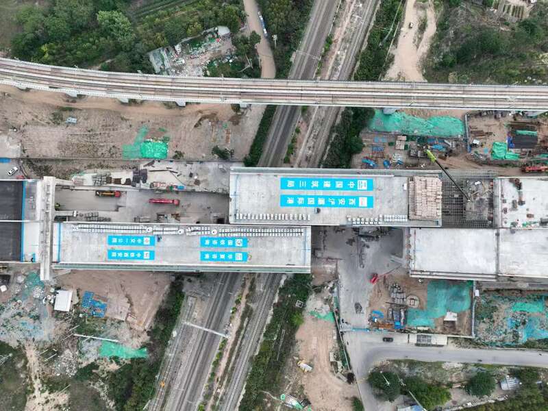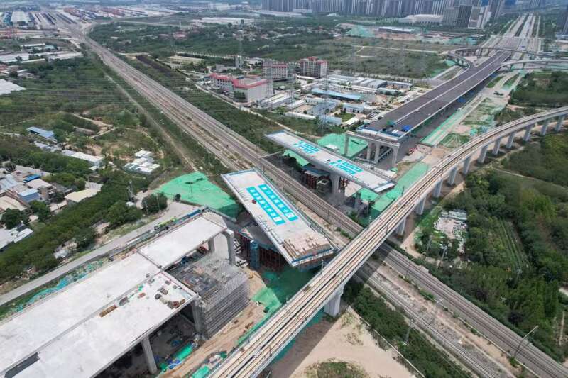 作为一条关键的“空中纽带”,“一带一路”中欧班列西安集结中心空铁联运项目——1.2公里长的主线桥+3条匝道,要串联起铁路、公路运输网。然而,这里的施工场地堪比“轨道迷宫”:离中欧班列货运北环线、西安地铁10号线不足2米,旁边还有规划的西安地铁3号线通道,就像在“高压线”的夹缝间干活,碰不得、错不得。