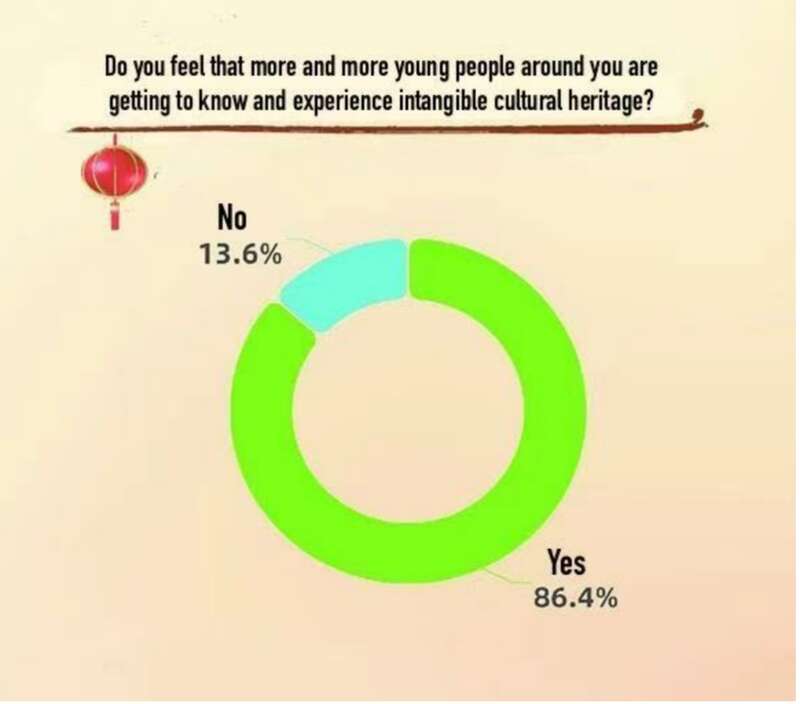 A recent survey conducted by the China Youth Daily Social Survey Center in collaboration with Wenjuan.com involved 1,500 young people born between 1990 and 2009. The results showed that 86.4% of the respondents feel that more young people around them are learning about and experiencing Intangible Cultural Heritage (ICH).