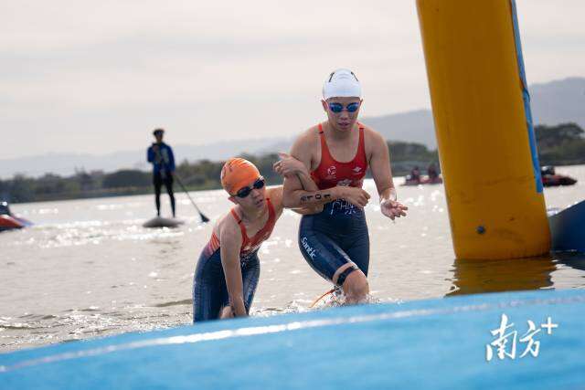11月27日,肇庆砚阳湖畔,全国第十二届残疾人运动会暨第九届特殊奥林匹克运动会(以下简称“残特奥会”)铁人三项赛场,全盲运动员杨晓婷在引导员谭嘉怡的牵引下,踉跄冲线,完成750米游泳、20公里自行车、5公里跑步的高强度赛程。