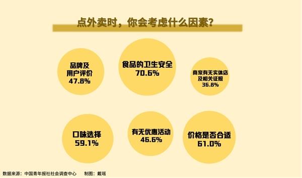 下班累了来一份盖浇饭、和朋友在家小聚点一只炸鸡、和同学拼一单奶茶……如今,外卖已融入年轻人的生活。日前,中国青年报社社会调查中心联合问卷网(wenjuan.com),对1335名受访者进行的一项调查显示,74.1%的受访者每周至少点一次外卖,70.6%的受访者点外卖最关心卫生安全。