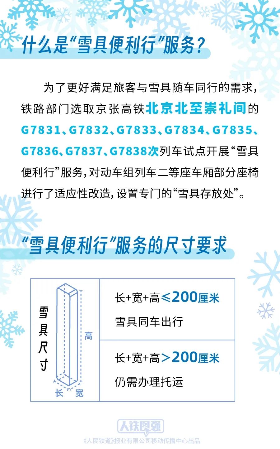 铁路部门坚持以人民为中心的发展思想,持续深化运输供给侧结构性改革,积极适应旅客多样化的出行需求,为携带雪具出行的旅客提供便捷服务。前期,铁路部门按照《国铁集团铁路旅客运输规程》“旅客乘坐动车组列车随身携带的行李物品长、宽、高之和不超过130厘米”的规定,对超过上述尺寸标准的雪具推出了“雪具快运”服务。为了更好满足旅客与雪具随车同行的需求,铁路部门统筹考虑旅客安全、乘车秩序和雪具运输需求,选取京张高铁北京北至崇礼间的G7831、G7832、G7833、G7834、G7835、G7836、G7837、G7838次列车 试点开展“雪具便利行”服务,对动车组列车二等座车厢部分座椅进行了适应性改造,设置专门的“雪具存放处”,旅客选择该服务后可携带长、宽、高之和不超过200厘米的雪具同车出行,滑雪更加方便快捷。对于长、宽、高之和超过200厘米的雪具,由于高铁列车车内空间限制,仍需办理托运。