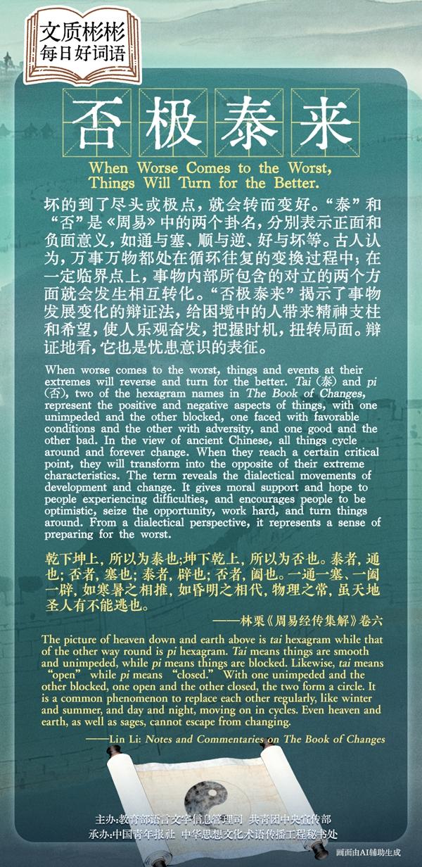 坏的到了尽头或极点,就会转而变好。“泰”和“否”是《周易》中的两个卦名,分别表示正面和负面意义,如通与塞、顺与逆、好与坏等。古人认为,万事万物都处在循环往复的变换过程中;在一定临界点上,事物内部所包含的对立的两个方面就会发生相互转化。“否极泰来”揭示了事物发展变化的辩证法,给困境中的人带来精神支柱和希望,使人乐观奋发,把握时机,扭转局面。辩证地看,它也是忧患意识的表征。
