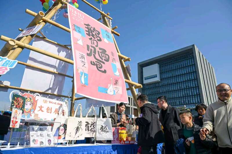 步入市集,游客可以在“宝藏鹅”与“手艺鹅”区域淘选琳琅满目的手作好物,欣赏非遗技艺,也可以驻足观赏传统技艺的现场制作;在“游戏鹅”专区,则可以与互动体验官对弈,享受思考与游戏的乐趣。而现场演奏的流行乐、爵士乐与传统戏曲交织在一起,营造层次丰富的文化氛围。同时,合肥文商旅融合重点活动“百戏入皖”展览与“鹅馆读者市集”在同一时空下交融,形成传统戏曲与现代市集的完美结合。