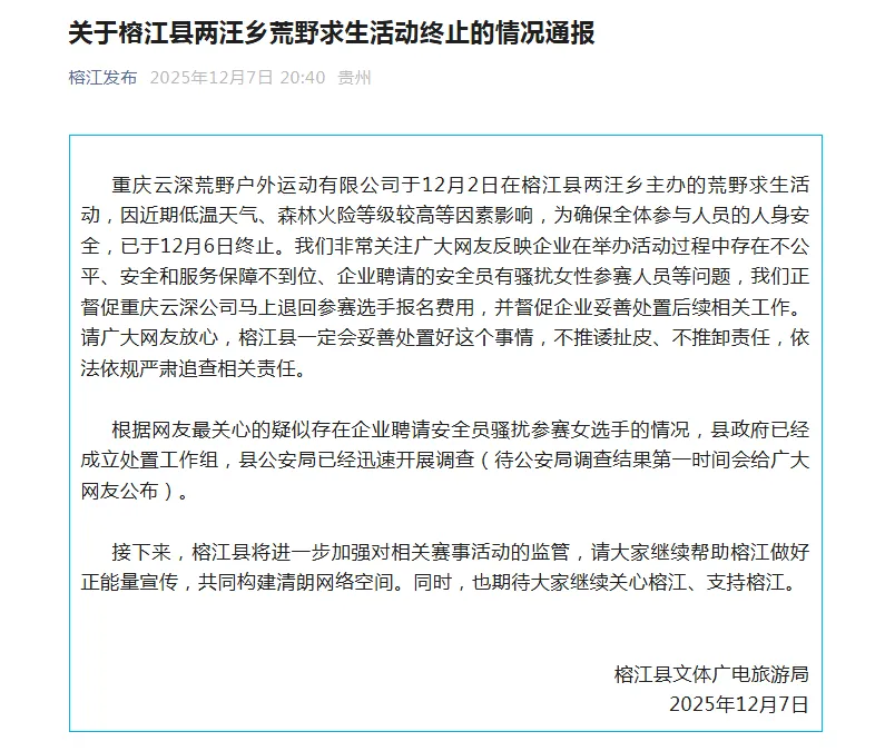 12月2日,贵州榕江版“荒野求生赛”正式开赛,不过开赛仅4天,在12月6日,网上出现消息称榕江版“荒野求生赛”被要求停赛。同时,在网上还出现了关于该赛事存在“安全员骚扰女选手”、“违规投喂选手”的相关举报,也让这项比赛引发诸多讨论。