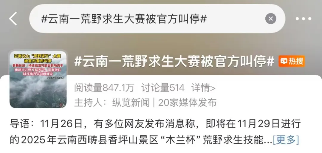 11月26日,有多位网友发布消息称,原定于11月29日进行的2025年云南西畴县香坪山景区“木兰杯”荒野求生技能大赛被紧急叫停。