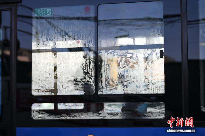 资料图:11月27日,内蒙古呼和浩特市,公交车玻璃结冰。中新社记者 刘文华 摄