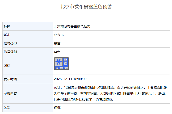 北京市发布暴雪蓝色预警 预计明日白天开始影响城区