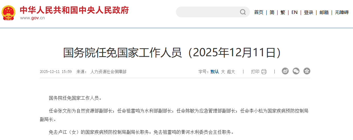 任命张文彤为自然资源部副部长;任命祖雷鸣为水利部副部长;任命陈敏为应急管理部副部长;任命李小松为国家疾病预防控制局副局长。